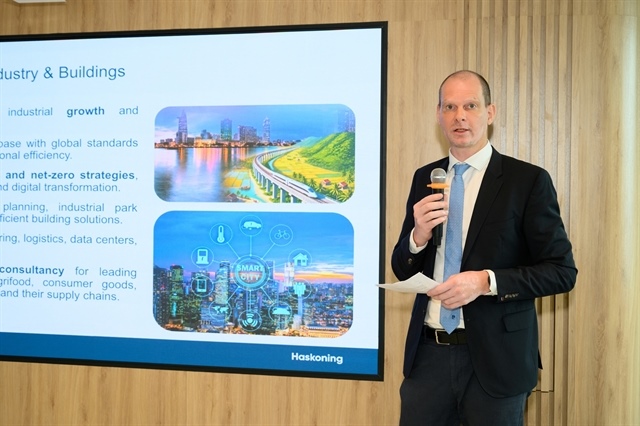 Joost Jan Oosterhuis, director advisory group Industry & buildings, Haskoning Vietnam makes a speech at the media meeting in HCM City. Haskoning affirms that Việt Nam plays an important role in its strategy and sustainability ambitions. — Photo courtesy of Haskoning